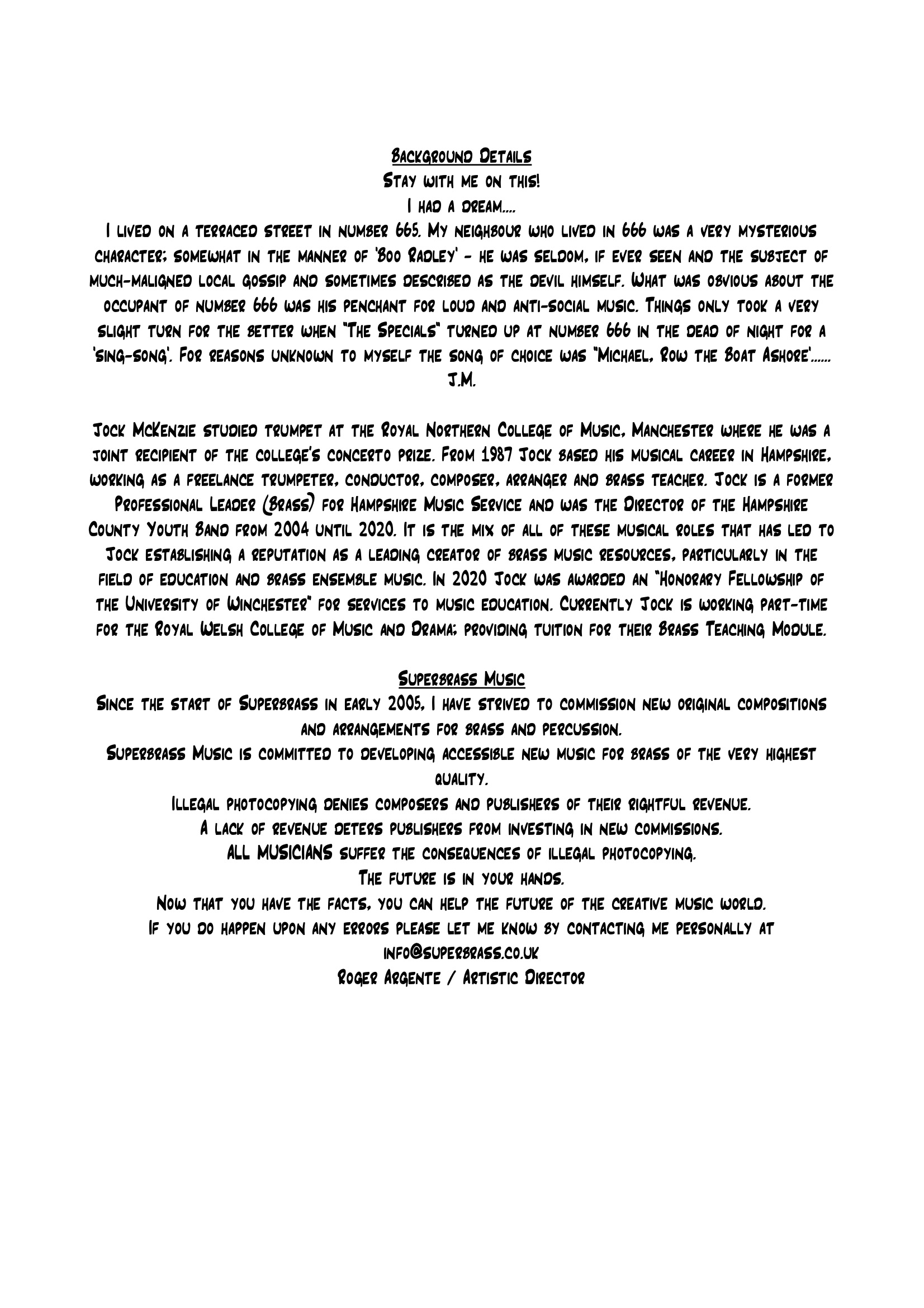 Jock McKenzie studied trumpet at the Royal Northern College of Music, Manchester where he was a joint recipient of the college’s concerto prize. Since 1987 Jock has based his musical career in Hampshire, working as a freelance trumpeter, conductor, composer, arranger and brass teacher. Currently Jock holds the position of Professional Leader (Brass) for Hampshire Music Service and is the Director of the Hampshire County Youth Band. It is the mix of all of these musical roles that has led to Jock establishing a reputation as a leading creator of brass music resources, particularly in the field of education and brass ensemble music. In 2020 Jock was awarded an "Honary Fellowship of the University of Winchester" for services to music education. Currently Jock is working part-time for the Royal Welsh College of Music and Drama; providing tuition for the Brass Teaching Module. In 2024 Jock was given the award for "Services to Youth" by Brass Bands England.