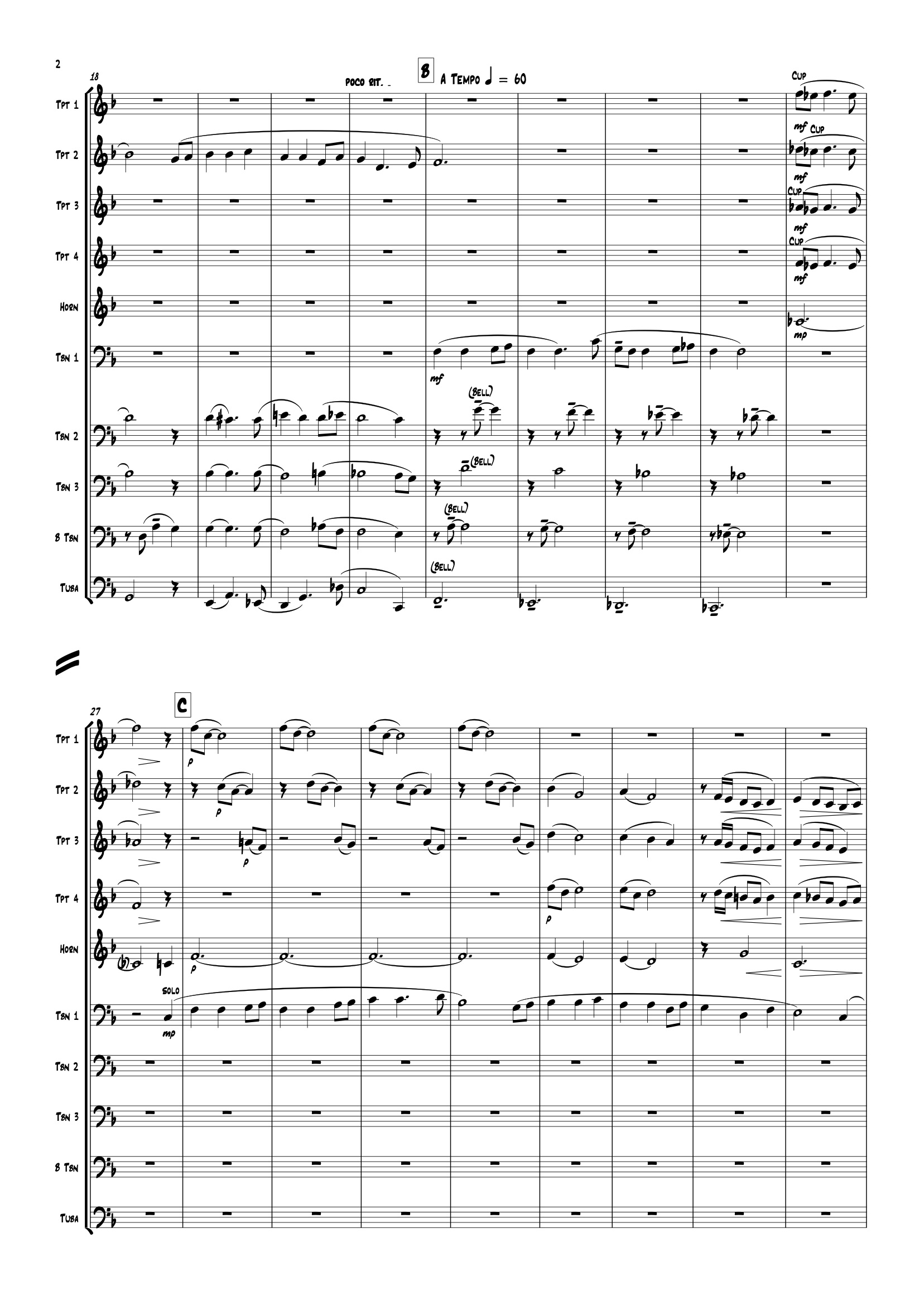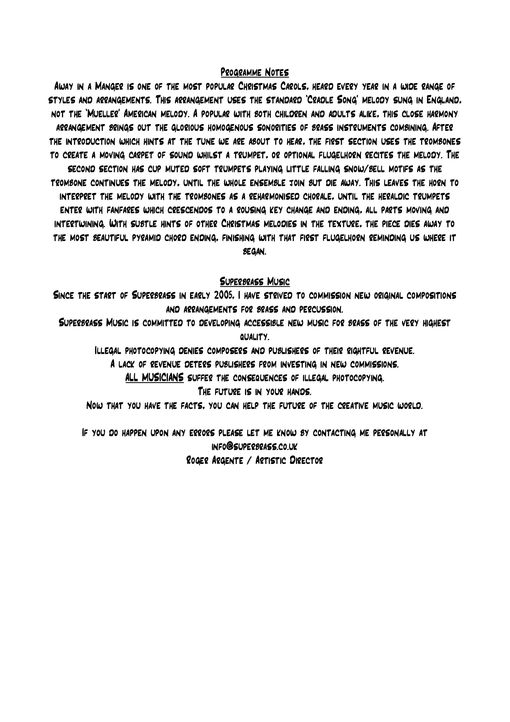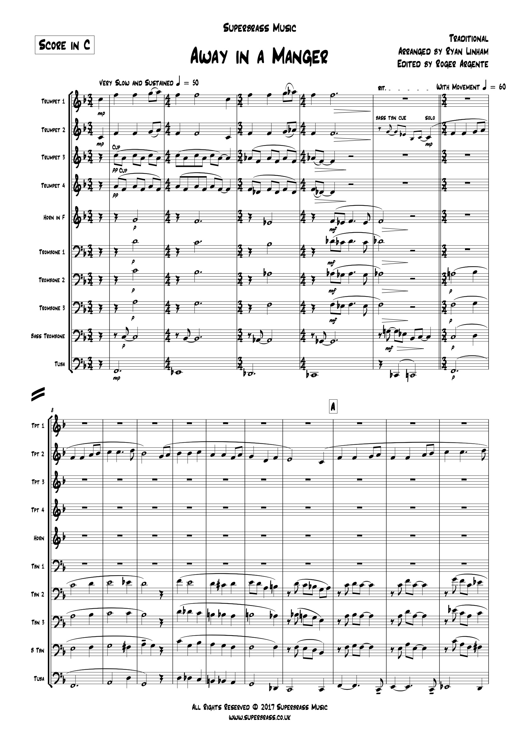 Away in a Manger is one of the most popular Christmas Carols, heard every year in a wide range of styles and arrangements. This arrangement uses the standard ‘Cradle Song’ melody sung in England, not the ‘Mueller’ American melody. A popular with both children and adults alike, this close harmony arrangement brings out the glorious homogenous sonorities of brass instruments combining. After the introduction which hints at the tune we are about to hear, the first section uses the trombones to create a moving carpet of sound whilst a trumpet, or optional flugelhorn recites the melody. The second section has cup muted soft trumpets playing little falling snow/bell motifs as the trombone continues the melody, until the whole ensemble join but die away. This leaves the horn to interpret the melody with the trombones as a reharmonised chorale, until the heraldic trumpets enter with fanfares which crescendos to a rousing key change and ending, all parts moving and intertwining. With subtle hints of other Christmas melodies in the texture, the piece dies away to the most beautiful pyramid chord ending, finishing with that first flugelhorn reminding us where it began.