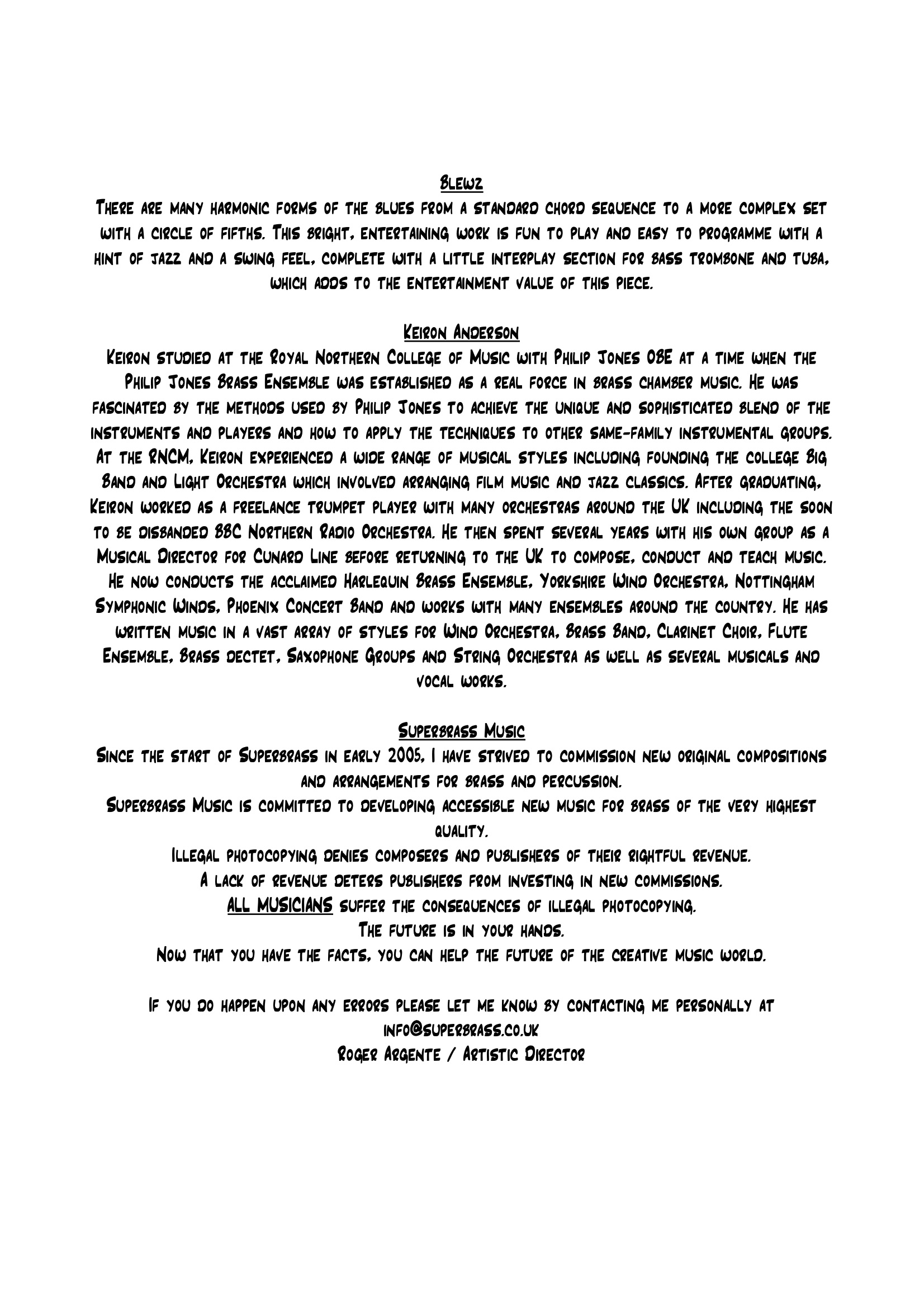 There are many harmonic forms of the blues from a standard chord sequence to a more complex set with a circle of fifths. This bright, entertaining work is fun to play and easy to programme with a hint of jazz and a swing feel, complete with a little interplay section for bass trombone and tuba, which adds to the entertainment value of this piece.