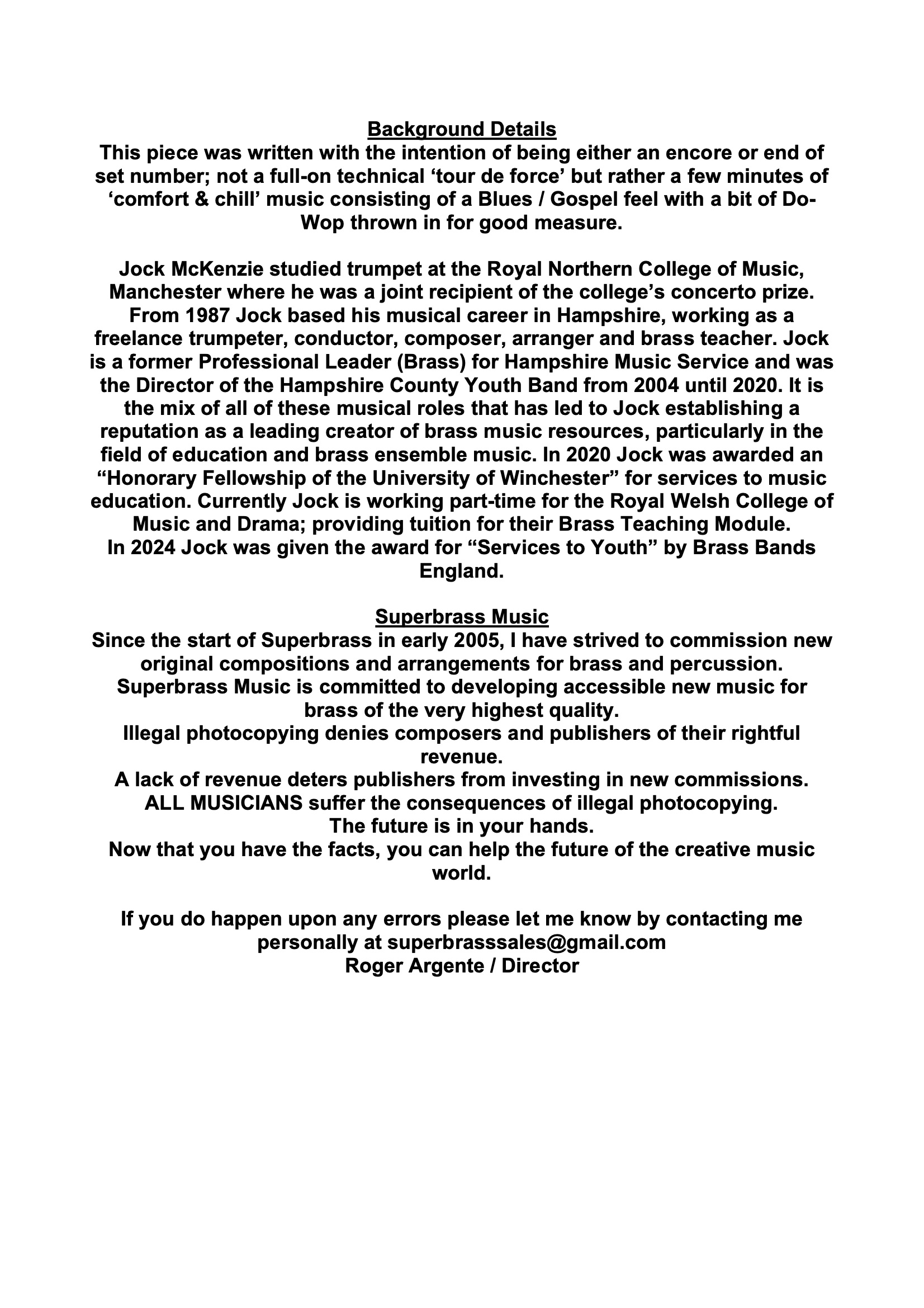 Jock McKenzie studied trumpet at the Royal Northern College of Music, Manchester where he was a joint recipient of the college’s concerto prize. Since 1987 Jock has based his musical career in Hampshire, working as a freelance trumpeter, conductor, composer, arranger and brass teacher. Currently Jock holds the position of Professional Leader (Brass) for Hampshire Music Service and is the Director of the Hampshire County Youth Band. It is the mix of all of these musical roles that has led to Jock establishing a reputation as a leading creator of brass music resources, particularly in the field of education and brass ensemble music. In 2020 Jock was awarded an "Honary Fellowship of the University of Winchester" for services to music education. Currently Jock is working part-time for the Royal Welsh College of Music and Drama; providing tuition for the Brass Teaching Module. In 2024 Jock was given the award for "Services to Youth" by Brass Bands England.