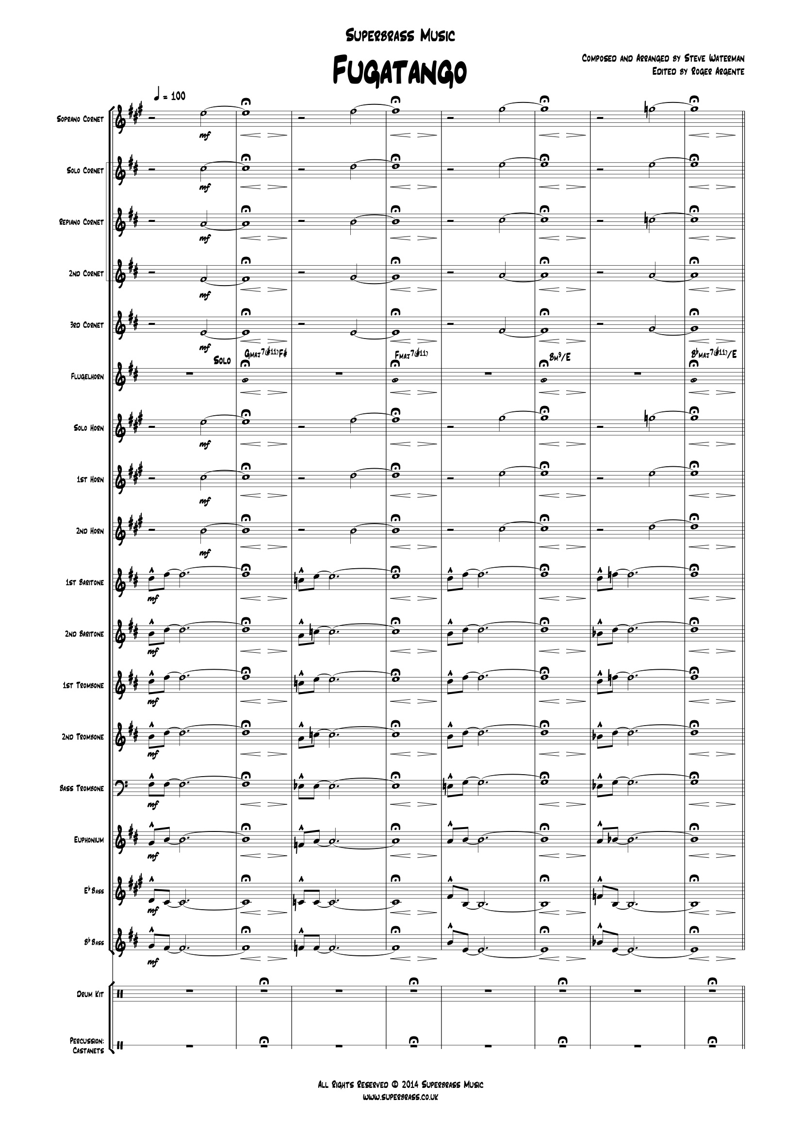 "When Roger Argente approached me to write a composition for his Spanish flavoured brass project, he made the suggestion that a Tango, although more Argentinian than Spanish, would fit in well with the overall concept. I have always been a very big fan of the music of Argentinian composer Astor Piazzolla and particularly the way that the Tango could be combined with jazz. A favourite recording of mine is of Piazzolla himself performing (on the bandoneon) with the jazz saxophonist Gerry Mulligan. Roger and I both thought it would be a good idea to let some of the musicians in the ensemble take improvised solos. As the composing progressed, a fugato also emerged hence the title Fugatango."