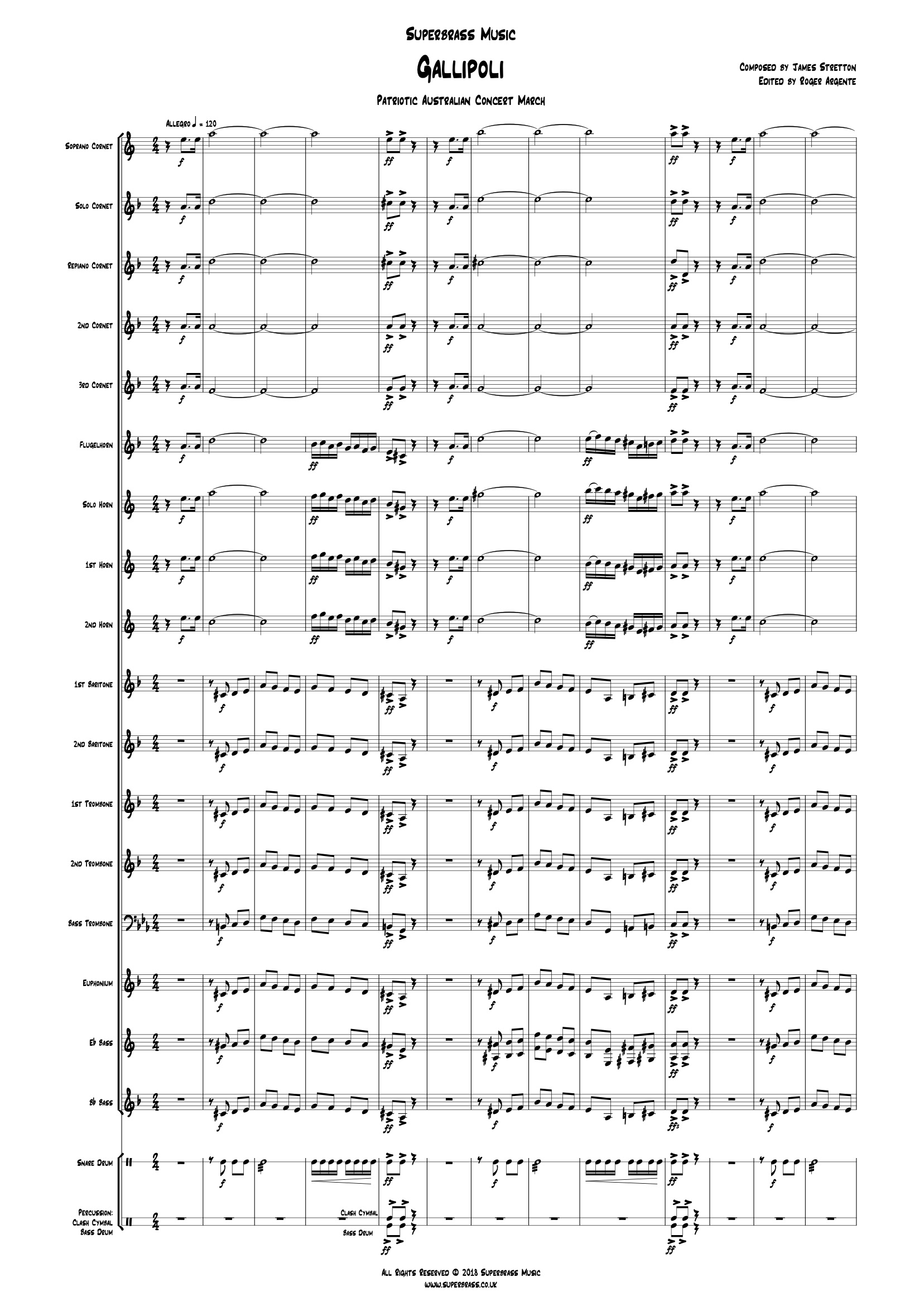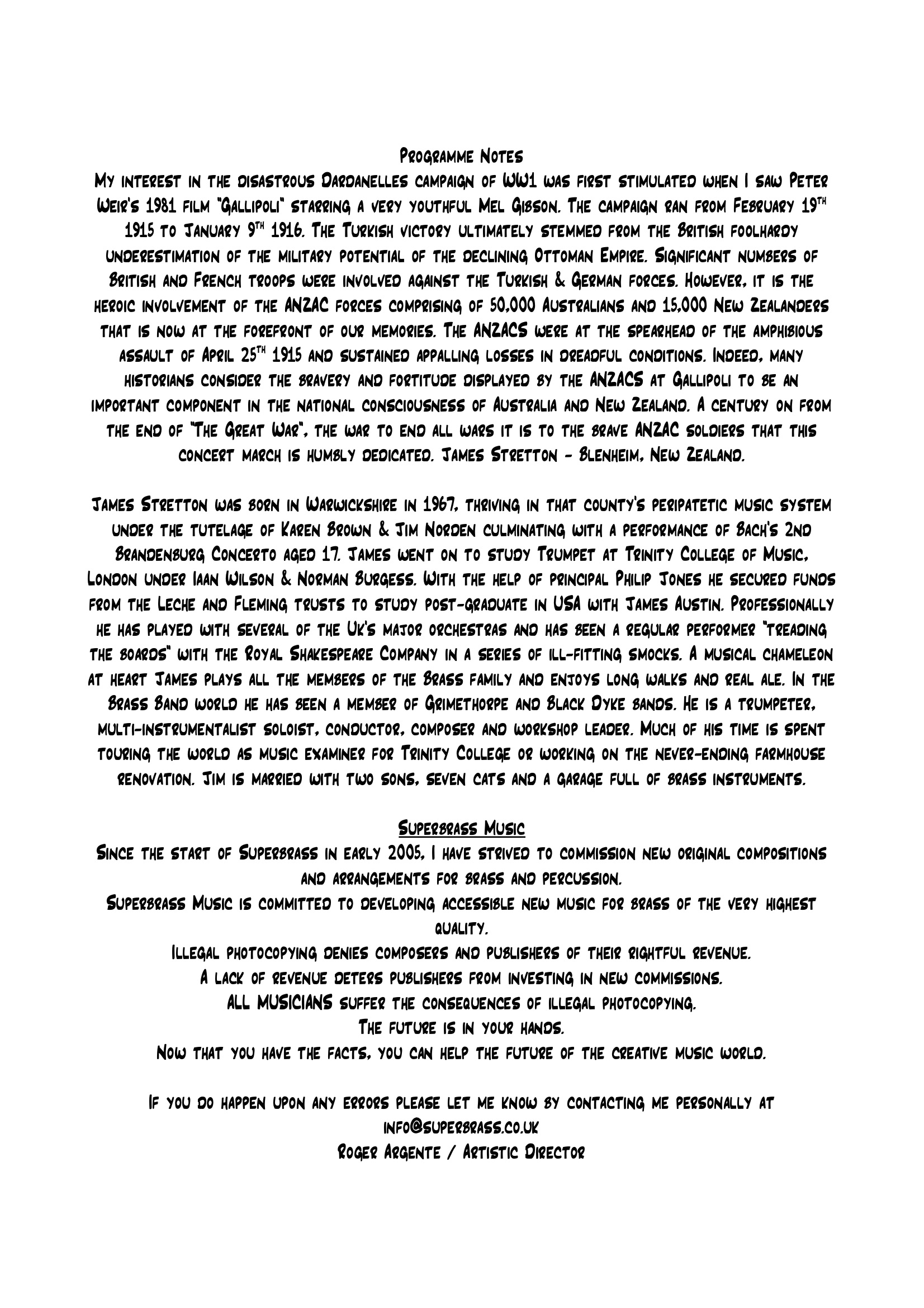 My interest in the disastrous Dardanelles campaign of WW1 was first stimulated when I saw Peter Weir's 1981 film "Gallipoli" starring a very youthful Mel Gibson. The campaign ran from February 19th 1915 to January 9th 1916. The Turkish victory ultimately stemmed from the British foolhardy underestimation of the military potential of the declining Ottoman Empire. Significant numbers of British and French troops were involved against the Turkish & German forces. However, it is the heroic involvement of the ANZAC forces comprising of 50,000 Australians and 15,000 New Zealanders that is now at the forefront of our memories. The ANZACS were at the spearhead of the amphibious assault of April 25th 1915 and sustained appalling losses in dreadful conditions. Indeed, many historians consider the bravery and fortitude displayed by the ANZACS at Gallipoli to be an important component in the national consciousness of Australia and New Zealand. A century on from the end of "The Great War", the war to end all wars it is to the brave ANZAC soldiers that this concert march is humbly dedicated. James Stretton - Blenheim, New Zealand.