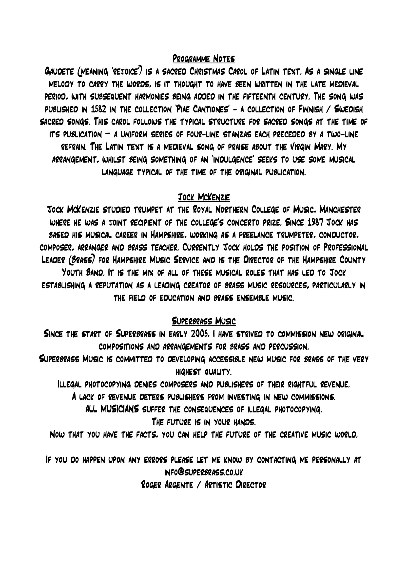 Gaudete (meaning ‘rejoice’) is a sacred Christmas Carol of Latin text. As a single line melody to carry the words, is it thought to have been written in the late medieval period, with subsequent harmonies being added in the fifteenth century. The song was published in 1582 in the collection ‘Piae Cantiones’ - a collection of Finnish / Swedish sacred songs. This carol follows the typical structure for sacred songs at the time of its publication – a uniform series of four-line stanzas each preceded by a two-line refrain. The Latin text is a medieval song of praise about the Virgin Mary. My arrangement, whilst being something of an ‘indulgence’ seeks to use some musical language typical of the time of the original publication.