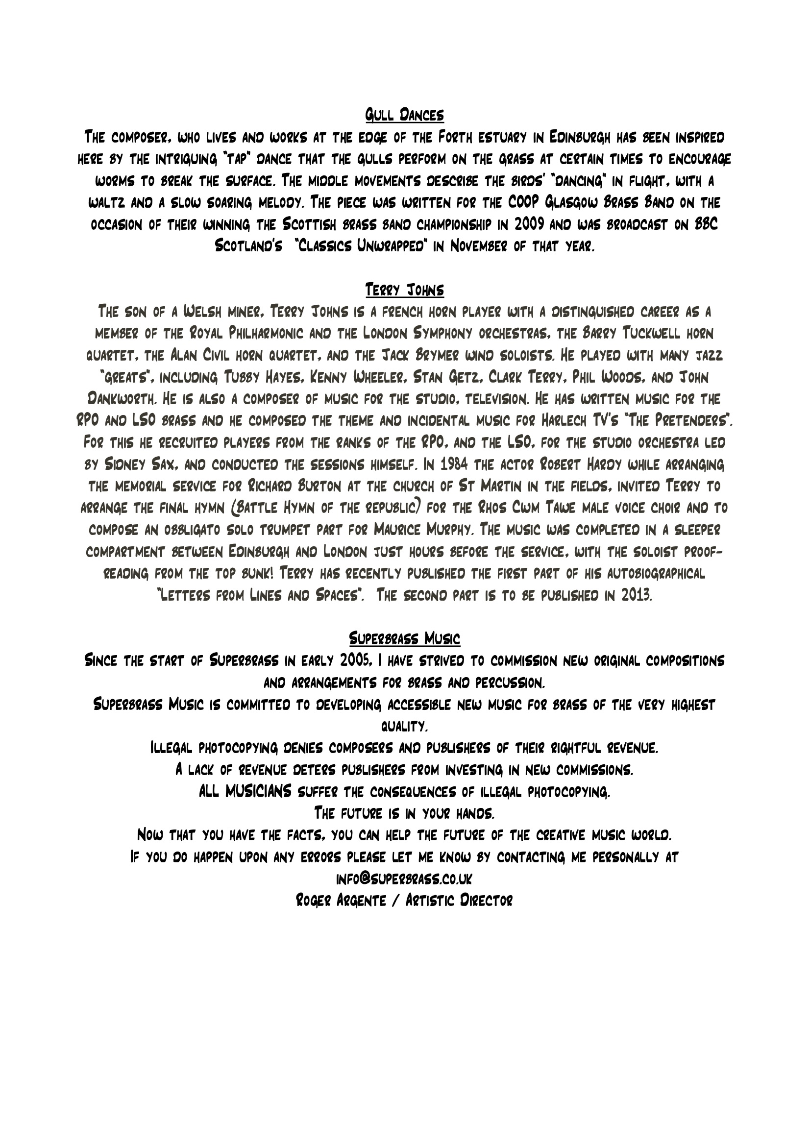 The composer, who lives and works at the edge of the Forth estuary in Edinburgh has been inspired here by the intriguing “tap” dance that the gulls perform on the grass at certain times to encourage worms to break the surface. The middle movements describe the birds’ “dancing” in flight, with a waltz and a slow soaring melody. The piece was written for the COOP Glasgow Brass Band on the occasion of their winning the Scottish brass band championship in 2009 and was broadcast on BBC Scotland’s “Classics Unwrapped” in November of that year.