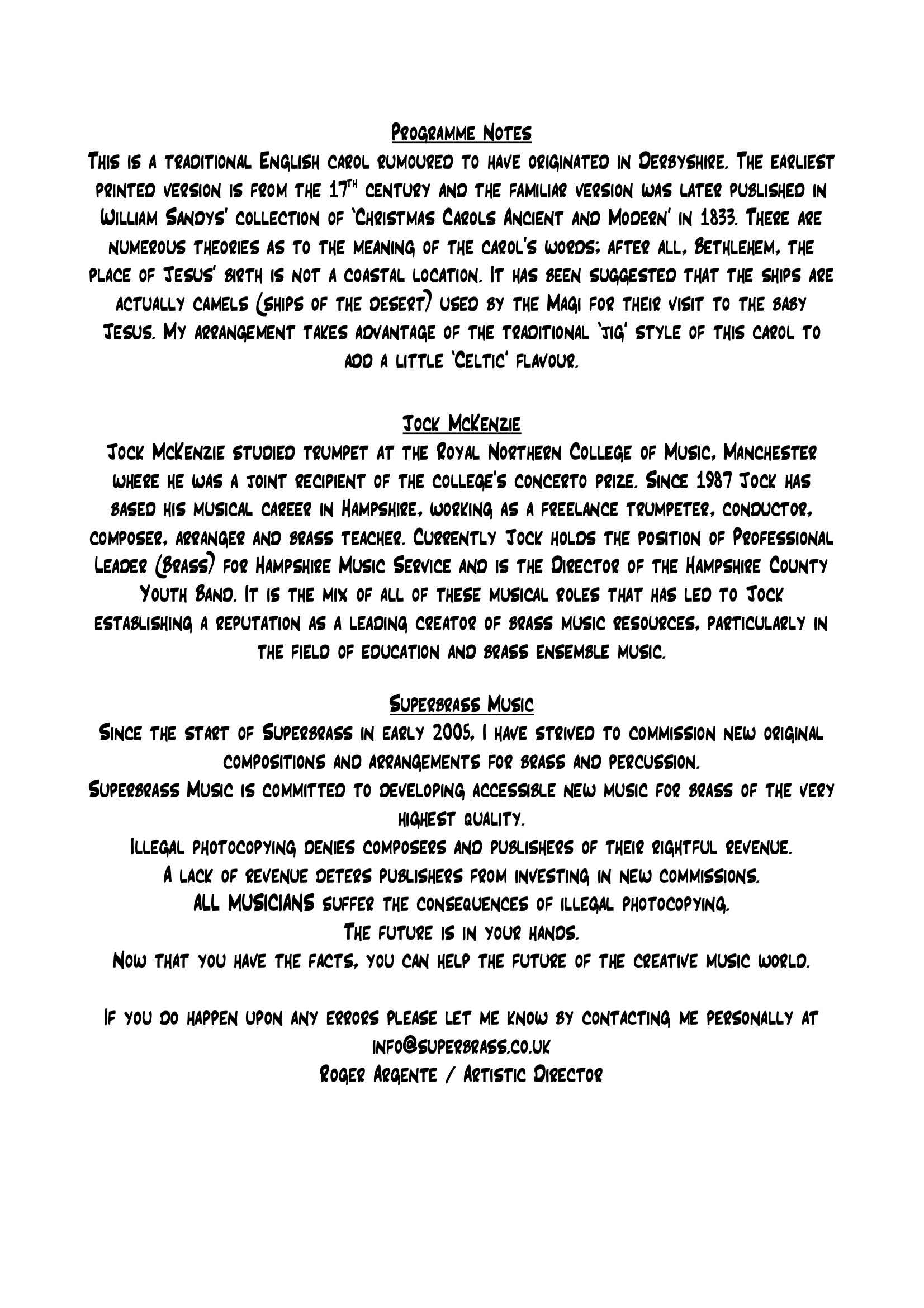 Jock McKenzie studied trumpet at the Royal Northern College of Music, Manchester where he was a joint recipient of the college’s concerto prize. Since 1987 Jock has based his musical career in Hampshire, working as a freelance trumpeter, conductor, composer, arranger and brass teacher. Currently Jock holds the position of Professional Leader (Brass) for Hampshire Music Service and is the Director of the Hampshire County Youth Band. It is the mix of all of these musical roles that has led to Jock establishing a reputation as a leading creator of brass music resources, particularly in the field of education and brass ensemble music.
