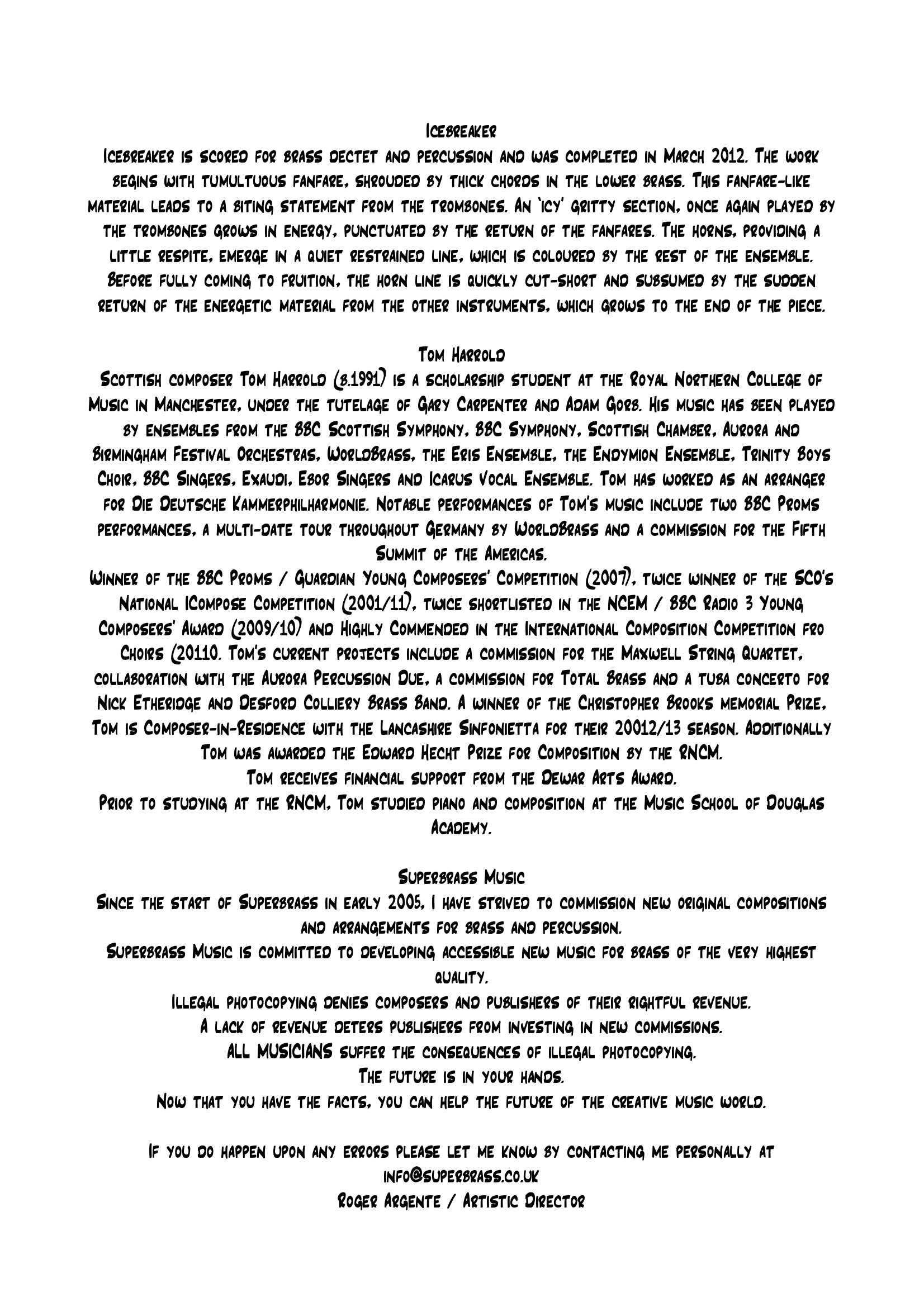 Scottish composer Tom Harrold (b.1991) is a scholarship student at the Royal Northern College of Music in Manchester, under the tutelage of Gary Carpenter and Adam Gorb. His music has been played by ensembles from the BBC Scottish Symphony, BBC Symphony, Scottish Chamber, Aurora and Birmingham Festival Orchestras, WorldBrass, the Eris Ensemble, the Endymion Ensemble, Trinity Boys Choir, BBC Singers, Exaudi, Ebor Singers and Icarus Vocal Ensemble. Tom has worked as an arranger for Die Deutsche Kammerphilharmonie. Notable performances of Tom’s music include two BBC Proms performances, a multi-date tour throughout Germany by WorldBrass and a commission for the Fifth Summit of the Americas. Winner of the BBC Proms / Guardian Young Composers’ Competition (2007), twice winner of the SCO’s National I Compose Competition (2001/11), twice shortlisted in the NCEM / BBC Radio 3 Young Composers’ Award (2009/10) and Highly Commended in the International Composition Competition for Choirs (2011). Tom’s current projects include a commission for the Maxwell String Quartet, collaboration with the Aurora Percussion Due, a commission for Total Brass and a tuba concerto for Nick Etheridge and Desford Colliery Brass Band. A winner of the Christopher Brooks memorial Prize, Tom is Composer-in-Residence with the Lancashire Sinfonietta for their 20012/13 season. Additionally, Tom was awarded the Edward Hecht Prize for Composition by the RNCM. Tom receives financial support from the Dewar Arts Award. Prior to studying at the RNCM, Tom studied piano and composition at the Music School of Douglas Academy.