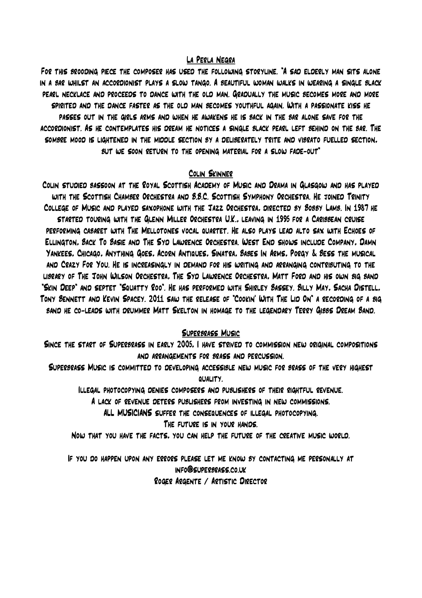For this brooding piece the composer has used the following storyline. “A sad elderly man sits alone in a bar whilst an accordionist plays a slow tango. A beautiful woman walks in wearing a single black pearl necklace and proceeds to dance with the old man. Gradually the music becomes more and more spirited and the dance faster as the old man becomes youthful again. With a passionate kiss he passes out in the girl’s arms and when he awakens he is back in the bar alone save for the accordionist. As he contemplates his dream he notices a single black pearl left behind on the bar. The sombre mood is lightened in the middle section by a deliberately trite and stylised trumpet duet, but we soon return to the opening material for a slow fade-out”
