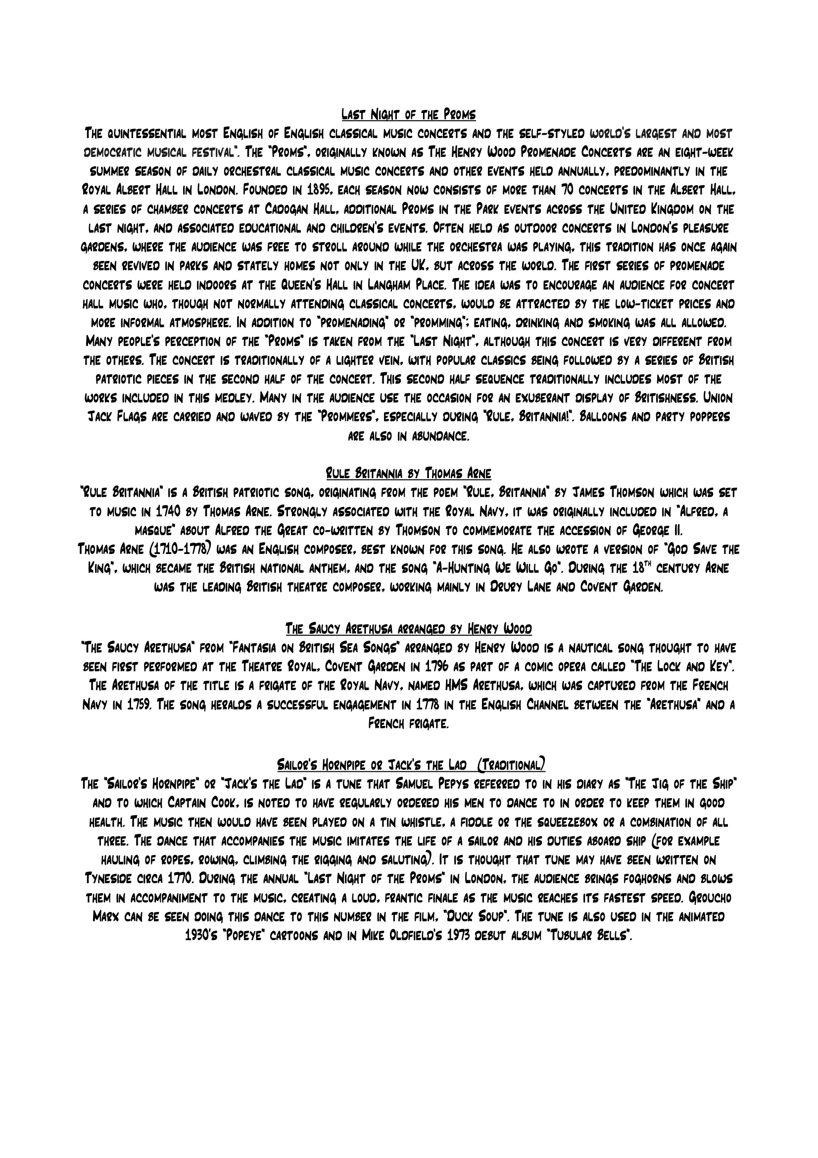 The quintessential most English of English classical music concerts and the self-styled world's largest and most democratic musical festival". The “Proms”, originally known as The Henry Wood Promenade Concerts are an eight-week summer season of daily orchestral classical music concerts and other events held annually, predominantly in the Royal Albert Hall in London. Founded in 1895, each season now consists of more than 70 concerts in the Albert Hall, a series of chamber concerts at Cadogan Hall, additional Proms in the Park events across the United Kingdom on the last night, and associated educational and children's events. Often held as outdoor concerts in London's pleasure gardens, where the audience was free to stroll around while the orchestra was playing, this tradition has once again been revived in parks and stately homes not only in the UK, but across the world. The first series of promenade concerts were held indoors at the Queen's Hall in Langham Place. The idea was to encourage an audience for concert hall music who, though not normally attending classical concerts, would be attracted by the low-ticket prices and more informal atmosphere. In addition to “promenading” or “promming”; eating, drinking and smoking was all allowed. Many people's perception of the “Proms” is taken from the “Last Night”, although this concert is very different from the others. The concert is traditionally of a lighter vein, with popular classics being followed by a series of British patriotic pieces in the second half of the concert. This second half sequence traditionally includes most of the works included in this medley. Many in the audience use the occasion for an exuberant display of Britishness. Union Jack Flags are carried and waved by the “Prommers”, especially during "Rule, Britannia!". Balloons and party poppers are also in abundance.