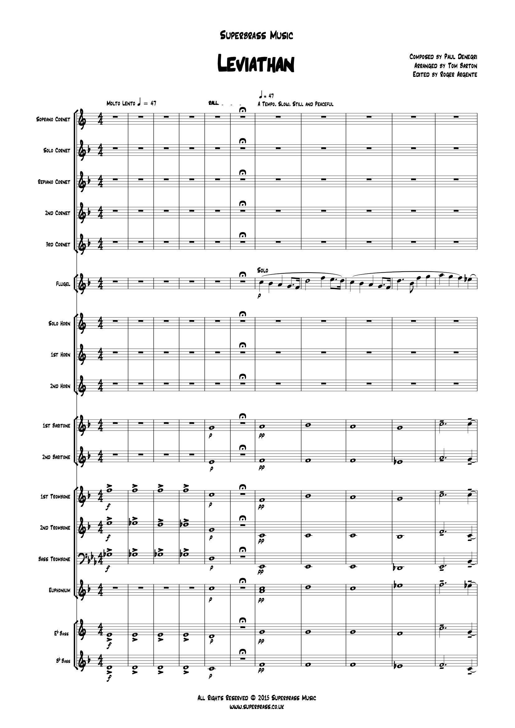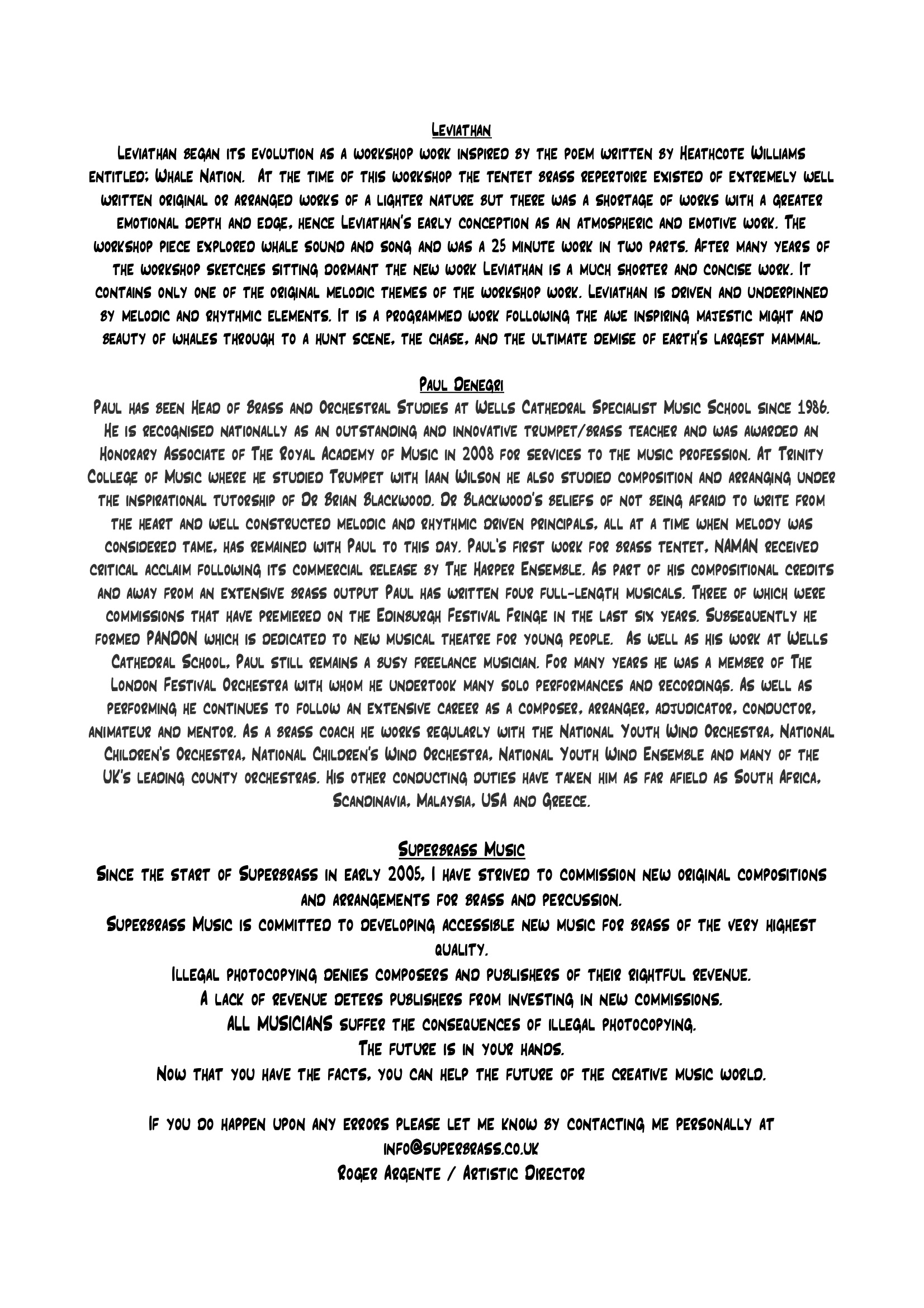 Leviathan began its evolution as a workshop work inspired by the poem written by Heathcote Williams entitled; Whale Nation. At the time of this workshop the tentet brass repertoire existed of extremely well written original or arranged works of a lighter nature but there was a shortage of works with a greater emotional depth and edge, hence Leviathan’s early conception as an atmospheric and emotive work. The workshop piece explored whale sound and song and was a 25-minute work in two parts. After many years of the workshop sketches sitting dormant the new work Leviathan is a much shorter and concise work. It contains only one of the original melodic themes of the workshop work. Leviathan is driven and underpinned by melodic and rhythmic elements. It is a programmed work following the awe inspiring majestic might and beauty of whales through to a hunt scene, the chase and the ultimate demise of earth’s largest mammal.