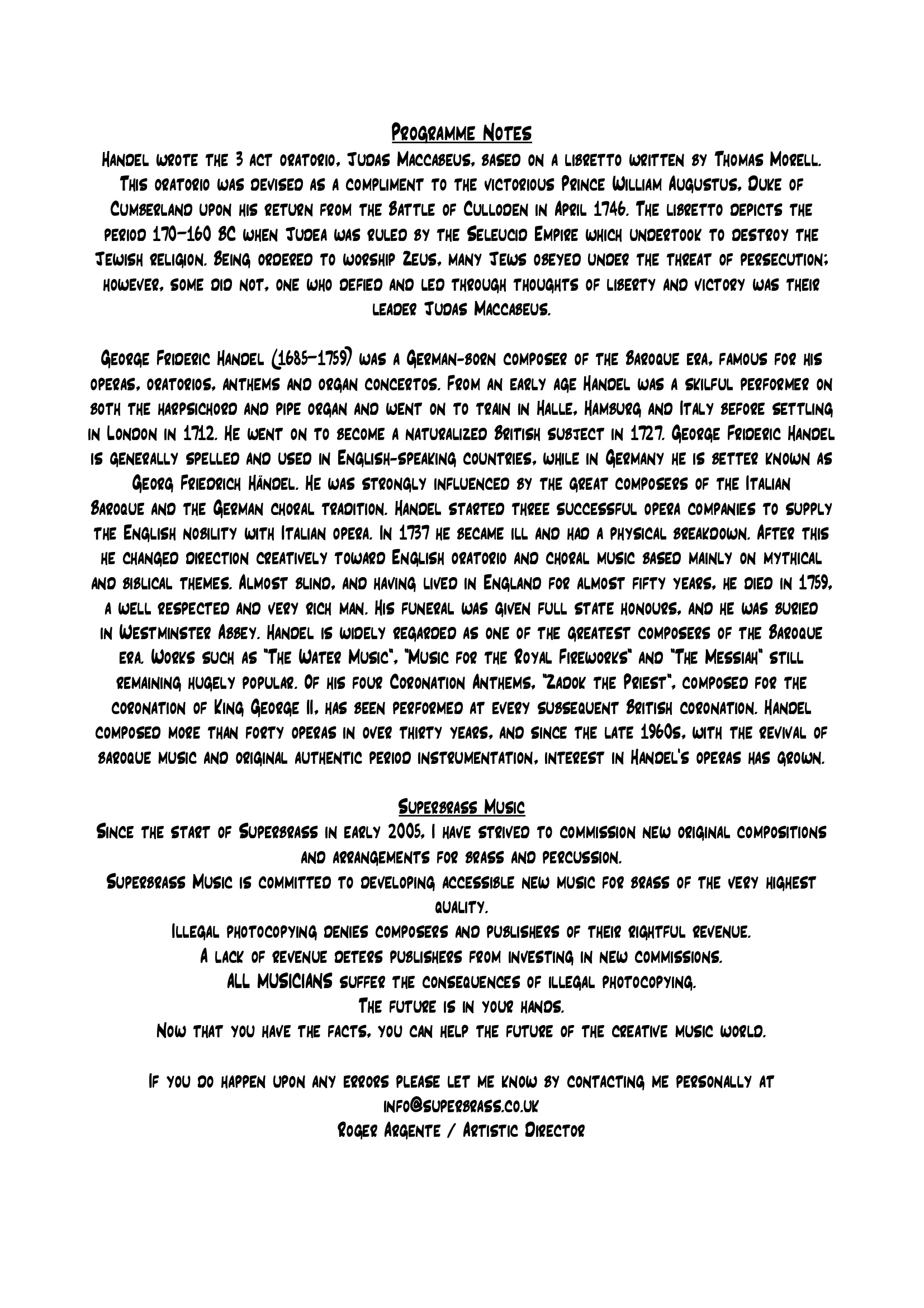 Handel wrote the 3 act oratorio, Judas Maccabeus, based on a libretto written by Thomas Morell. This oratorio was devised as a compliment to the victorious Prince William Augustus, Duke of Cumberland upon his return from the Battle of Culloden in April 1746. The libretto depicts the period 170–160 BC when Judea was ruled by the Seleucid Empire which undertook to destroy the Jewish religion. Being ordered to worship Zeus, many Jews obeyed under the threat of persecution; however, some did not, one who defied and led through thoughts of liberty and victory was their leader Judas Maccabeus.