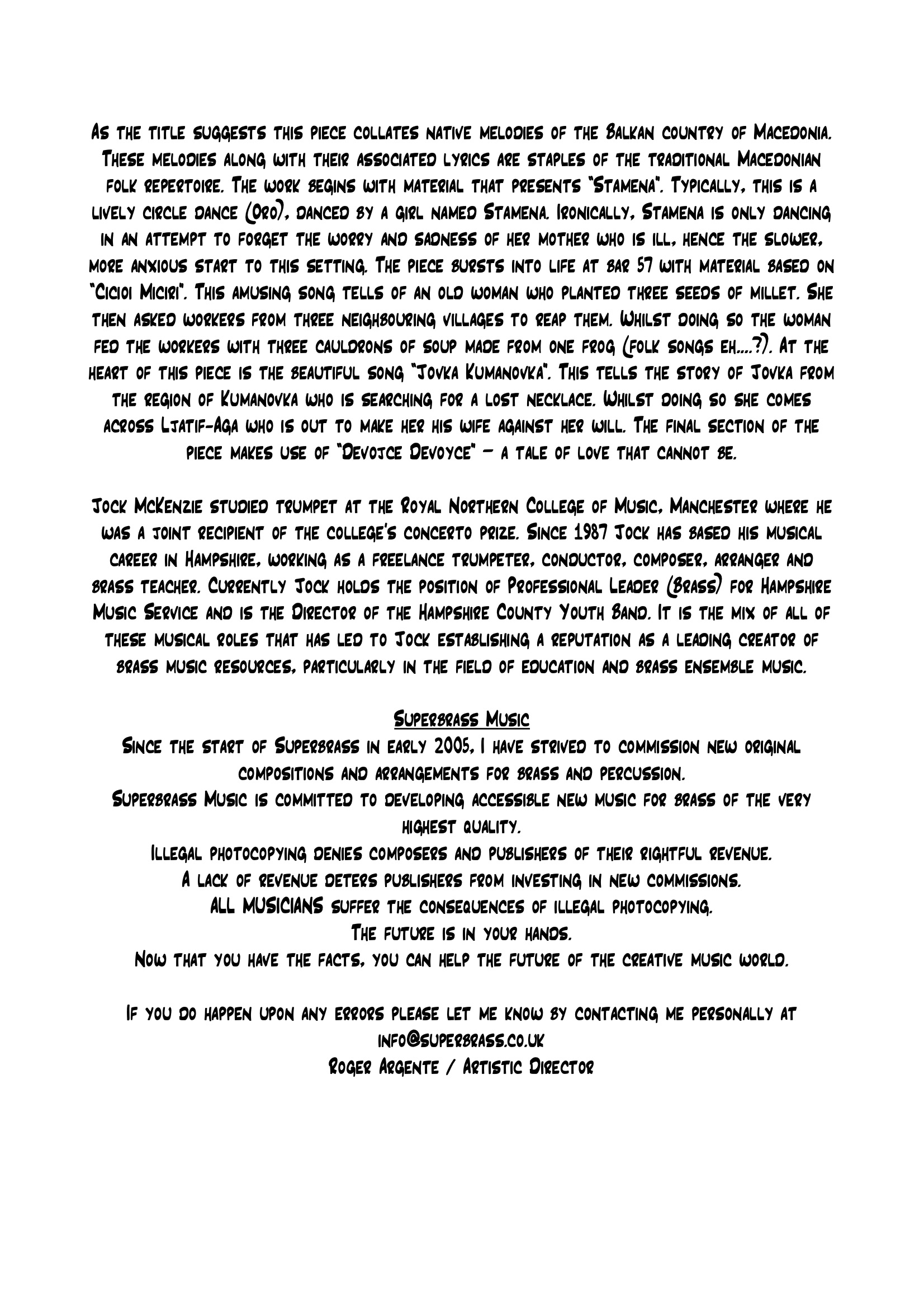 As the title suggests this piece collates native melodies of the Balkan country of Macedonia. These melodies along with their associated lyrics are staples of the traditional Macedonian folk repertoire. The work begins with material that presents “Stamena”. Typically, this is a lively circle dance (Oro), danced by a girl named Stamena. Ironically, Stamena is only dancing in an attempt to forget the worry and sadness of her mother who is ill, hence the slower, more anxious start to this setting. The piece bursts into life at bar 57 with material based on “Cicioi Miciri”. This amusing song tells of an old woman who planted three seeds of millet. She then asked workers from three neighbouring villages to reap them. Whilst doing so the woman fed the workers with three cauldrons of soup made from one frog (folk songs eh….?). At the heart of this piece is the beautiful song “Jovka Kumanovka”. This tells the story of Jovka from the region of Kumanovka who is searching for a lost necklace. Whilst doing so she comes across Ljatif-Aga who is out to make her his wife against her will. The final section of the piece makes use of “Devojce Devoyce” – a tale of love that cannot be.
