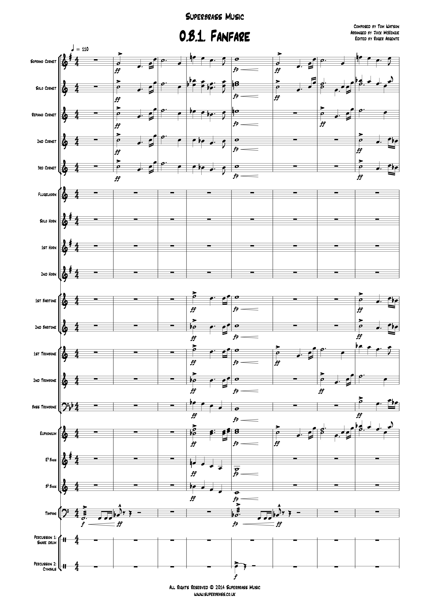 Tom Watson was born into a musical family in Hertfordshire, England and showed a flare for playing the trumpet from the age of just 4. Taught by his father James Watson, the prolific international soloist, conductor, educator and session trumpeter, Tom studied at the Royal Academy of Music, where he gained a first class honours degree. Whilst still at college, Tom embarked on a varied professional freelance-playing career and was guest principal trumpet with the Mahler Chamber Orchestra performing under Claudio Abbado, Daniel Harding, and Sir Neville Marriner. Tom can be regularly found performing and recording with the London Symphony Orchestra, The BBC National Orchestra of Wales and many of the UK's finest orchestras. Commercially, Tom has played in sessions or concerts for artists such as Sir Elton John, Sir Paul McCartney, Sir Tom Jones, Dame Shirley Bassey, Ozzy Osbourne, Phil Collins, Eric Clapton, Joe Cocker, Jarvis Cocker, Pete Doherty, Nick Cave, Karl Jenkins and Victoria Wood. Some of his film session work has included recording the scores for Brave, Eragon and Stormbreaker. Tom also works as a musical director, arranging and conducting various projects such as Tony Christie's album Made in Sheffield and for renowned harpist Catrin Finch. Tom also runs his own independent recording and production company Pro Audio, part of Prozone Music, which Tom owns and runs alongside his brother William. The O.B.1. Fanfare was written for the Harper Ensemble, a brass ensemble comprising of Tom's contemporaries from his time at the Royal Academy of Music. It was written for the Leicester Square UK premiere of the film "Ali" starring Will Smith. Composed as a salute to Hollywood and the big screen, this fine pastiche of film scoring is an ideal fanfare and concert opener.