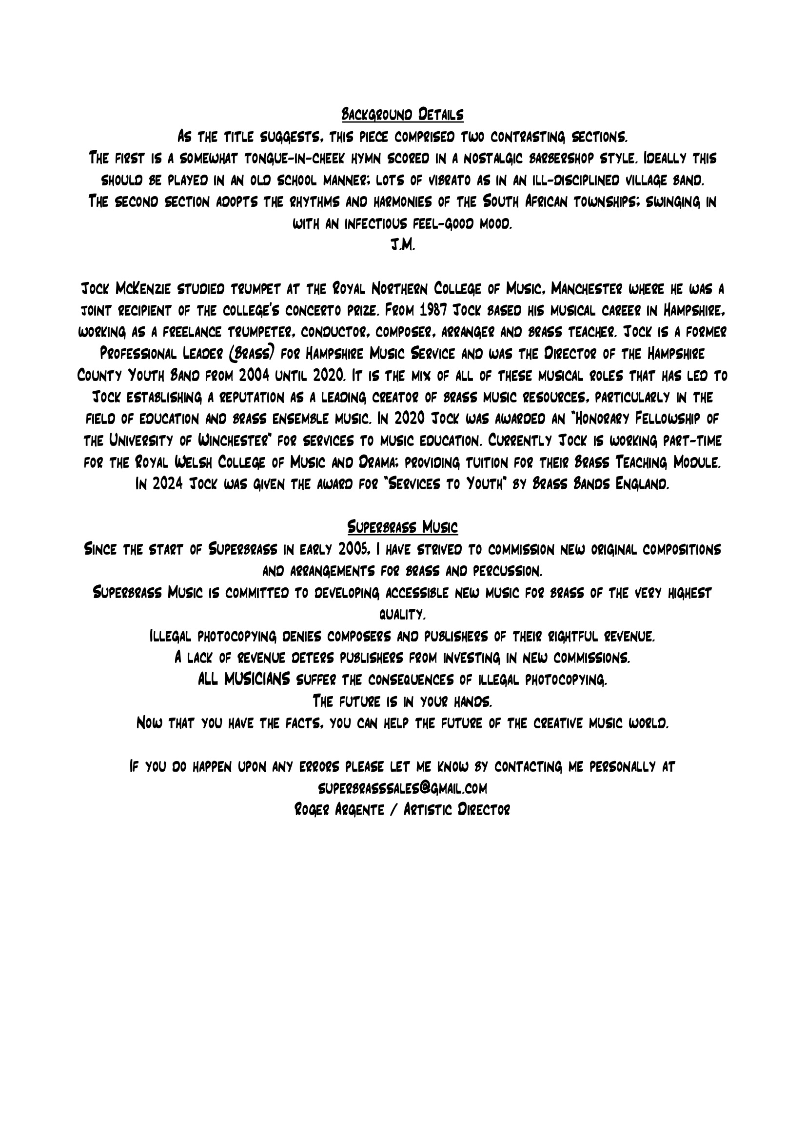 The first is a some what tongue-in-cheek hymn scored in a nostalgic barbershop style. Ideally this should be played in an old school manner; lots of vibrato as in an ill-disciplined village band.